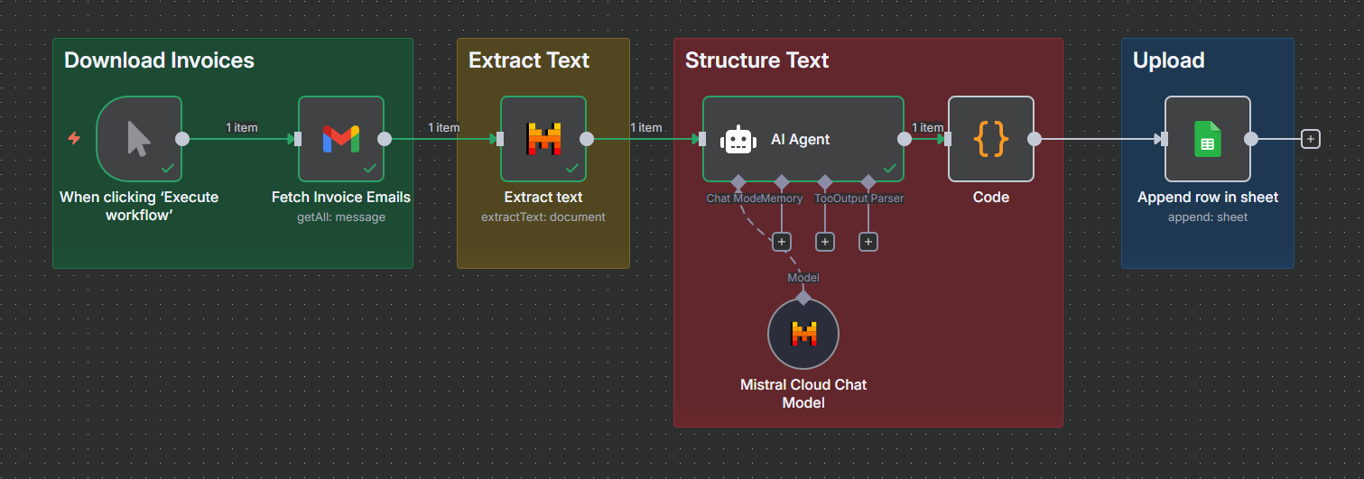 I used Mistral's OCR to extract text from the invoices received, then Mistral's LLM used the extracted text and structured it in the format needed: vendor name, payment amount, and due date. The system now automatically downloads every invoice, extracts important info, and saves it in a spreadsheet.